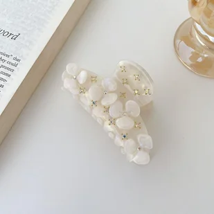 Cechy produktu Akrylowa spinka do włosów Zdobiona kolorowymi cyrkoniami Dostępna w pięciu wariantach kolorystycznych: wielokolorowy, niebieski, beżowy, biały i szary Materiał: akryl