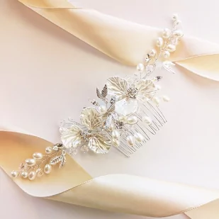 Grzebyk z perłowymI kwiatami srebrny do fryzury ślubnej Grzebyk z motywem kwiatowym chętnie wybierany jest przez Panny Młode szukające uzupełnienia swojej ślubnej stylizacji o dodatki w stylu rustykalnym. Dodatek cyrkonii i kryształków sprawia, że ozdoba pięknie połyskuje we włosach. Wymiary: Rozpiętość grzebyka 16,50 cm +/- 1,00 cm Szerokość maksymalna: 5,00 cm Kolor: srebrny, kryształowy, perłowy, silver Materiał: