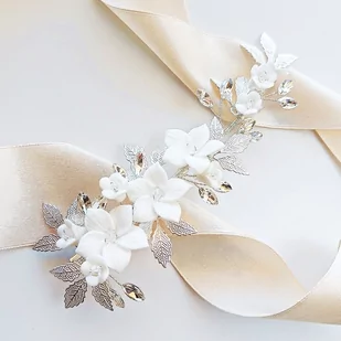 OZDOBNA spinka na włosy do fal hollywood z kwiatami cyrkoniami srebrna ŚLUBNA Spinki do włosów to zdecydowanie musthave większości ślubnych fryzur już od kilku sezonów. Przedstawiamy Ci srebrną spinkę na miarę trendy Panny Młodej w stylu boho glam. Spinka złożona jest z białych kwiatów z glinki, w towarzystwie metalowych i cyrkoniowych listków. Błyszczące elementy zwracają oczy w stronę upięcia, a w wieczorowym świetle bardzo ładnie go podkreślają. Dodatek kwiatów nadaje charakteru boho.
