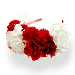 OPASKA DO WŁOSÓW BARWY NARODOWE - BIAŁO CZERWONE KWIATY NA CZERWONEJ OPASCE O SZEROKOŚCI 1 CM KWIATY Z TWORZYWA SZTUCZNEGO - GOŹDZIKI - ŁODYGA WKRĘCONA DO OPASKI - DODATKOWO KLEJONA WAGA OPASKI: 29g