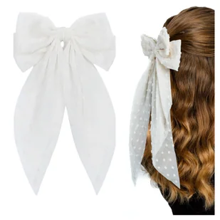Spinka do Włosów z Dużą Kokardą Biała Damska Kokardka Długa i Efektowna // Kokarda do włosów DŁUGA spinka biała ZDOBIONA kokardka damska EFEKTOWNA ✨ Najważniejsze cechy: ✔ Bardzo duża, biała klamra ✔ Z ozdobna kokardą ✔ Stylowy i elegancki dodatek ✔ Idealana nawet do grubych włosów Subtelna biała kokarda z fakturą drobnych kropeczek to idealny dodatek dla miłośniczek klasy i delikatności. Wykonana z lekkiego, przewiewnego materiału, pięknie się układa i dodaje wdzięku każdej stylizacji. Jej uniwersalny, pastelowy kolor pasuje zarówno do codziennych, jak i eleganckich zestawów. Doskonała do przypięcia we włosach, przy kołnierzyku lub na torebce – dodaje szyku i romantycznego uroku.