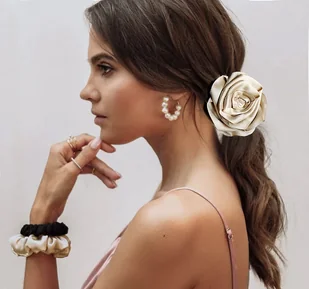 Piękna, frotka do włosów z różą z jedwabiu naturalnego. Zachwycająco wymodelowana, subtelna, lecz niebagatelna ozdoba do włosów, która podbije każdą stylizację. Gumka typu scrunchie jest genialnym dodatkiem do ...