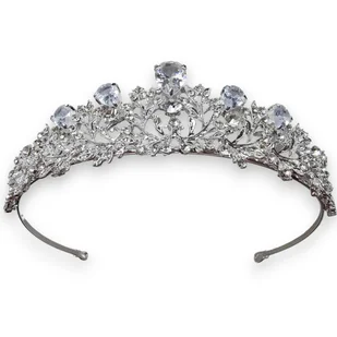 Elegancka tiara ślubna w kolorze srebrnym to idealna ozdoba na wyjątkowy dzień. Wykonana z metalu, ozdobiona cyrkoniami i delikatnym kamieniem górskim o nieb...