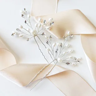 Zestaw dwóch kokówek spinek srebrnych z perełkami i cyrkoniami ślubne boho Komplet dwóch srebrnych wsuwek do włosów z motywem cyrkonowych listków i pereł uro...