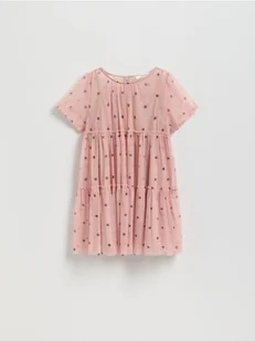 Sukienka o swobodnym fasonie, wykonana z tiulowego materiału.