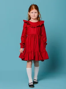 Sukienka Acacia z tkaniny bawełnianej w kolorze czerwonego wina. Sukienka ma długi rękaw wykończony gumką. Z tyły zapiana jest na kilka guziczków. Dół sukienki uszyty jest z dwóch falban. Z przodu i tyły przy ...