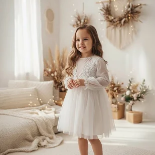 Sukienka tiulowa Mirella z miekkiej tkaniny sukienkowej marchiano, eleganckiej i matowej, z bufiastymi rekawkami i kokardami w kolorze beżowym, delikatnym i pastelowym zdobiona haftem na tiulu ecru ...