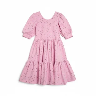 Mega słodka sukienka Periwinkle w kolorze różowym w małe czerwone serduszka. Sukienka ma efektowne bufiaste rękawy do łokcia. Dół uszyty jest z dwóch falban, które pięknie się układają i kręcą. Sukienka ma dłu ...