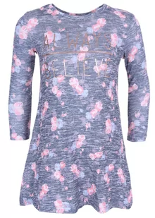 Szara, trapezowa sukienka w kwiatowy wzór, z okrągłym dekoltem, na długi rękaw. Na środku złoty napis ALWAYS BELIEVE. Sukienka wykonana jest z miękkiego, mił...