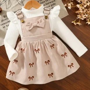 TEMU 2 szt. Dziewczęcy top z długim rękawem i falbankami + sukienka na ramiączkach z kokardą, uroczy strój na jesień i zimę, na zewnątrz