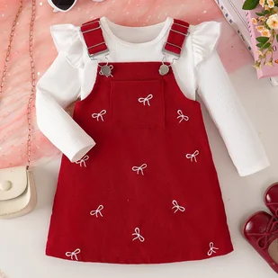 TEMU Dziewczęca bluzka w jednolitym kolorze z prążkowanym rękawem i falbankami + sztruksowa sukienka na ramiączkach z kokardką na Boże Narodzenie, na