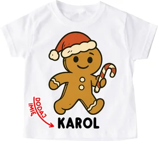Koszulka dla chłopca na Mikołajki z piernikiem i imieniem Przygotuj swojego małego bohatera na magiczny czas świąt z uroczą świąteczną. koszulką To idealny wybór dla dzieci, które kochają świąteczny klimat, ciepłe kakao, pierniczki i rodzinne chwile przy choince. Koszulka nie tylko zachwyca zabawnym, świątecznym nadrukiem, ale też gwarantuje maksymalny komfort noszenia – przez cały dzień zabawy, kolędowania i pakowania prezentów. Materiał i wykonanie Koszulka została wykonana w 100% bawełny, która jest miękka, przewiewna i przyjemna w dotyku. Zapewnia komfort nawet najbardziej ruchliwym maluchom.