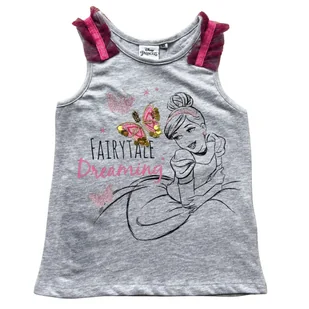 Bluzka dziewczęca Disney Princess – magiczny urok dla najmłodszych! Czarujący design: Szara bluzka bez rękawów z wizerunkiem Kopciuszka i napisem "Fairytale ...