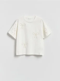 Reserved - Bawełniany t-shirt z aplikacjami - złamana biel