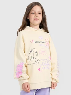 Bluza z kapturem 4F dziewczęca - CECHY: gramatura 280 gsm – zapewnia odpowiednią grubość materiału, idealną na chłodniejsze dni zakres rozmiarów 122–164 – dopasowany do potrzeb dzieci i młodzieży jednostronnie czesane wnętrze – zwiększa komfort termiczny dzięki dodatkowej warstwie ocieplenia krój oversize – luźny fason gwarantujący pełną swobodę ruchów standardowa długość do bioder – uniwersalne dopasowanie do sylwetki 80% bawełny – miękka, trwała i przyjemna w dotyku dzianina 20% poliestru – zwiększa odporność na zużycie i przedłuża trwałość produktu jednolita kolorystyka – łatwa do zestawienia z innymi elementami garderoby dzianina single jersey – gładka i miękka powierzchnia materiału zapewnia wysoki komfort noszenia kaptur zintegrowany z dekoltem – dodatkowa ochrona przed wiatrem i chłodem mankiety i dół wykończone ściągaczem – lepsze dopasowanie i ochrona przed utratą ciepła raglanowe rękawy – nadają sylwetce swobodny, sportowy charakter nadruk z przodu i na plecach – akcent podkreślający styl i charakter Bluza dresowa dziewczęca nierozpinana z kapturem idealnie sprawdzi się jako element zarówno casualowych, jak i sportowych stylizacji na co dzień. Posiada oversizowy krój, który luźno układa się na sylwetce i zapewnia swobodę. Splot single jersey z jednostronną gładką powierzchnią sprawia, że jest ona elastyczna i komfortowa w noszeniu. Bluza dresowa dziewczęca z kapturem posiada średnią gramaturę 280 gsm.