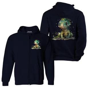 Kolorowa grafika małego gekona to atrakcja dla miłośnika jaszczurek. Wysokiej jakości rozpinana bluza z kapturem typu kangur. Pełne rozpięcie na zamek czyni bluzę niezwykle praktyczną i wygodną w codziennym użytkowaniu. Wygodna i trwała bluza młodzieżowa z kapturem to idealne rozwiązanie dla dzieci i nastolatków. Bluza zapewnia komfort i swobodę ruchów.