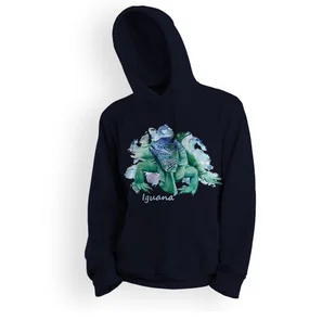 Wysokiej jakości bluza z kapturem typu kangur. Bluza z kolorowym nadrukiem iguany. Nadruk jest z dwóch stron bluzy. Druk jest nasycony kolorami, trwały, mięk...