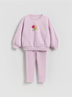 Komplet składający się z bluzy i spodni, wykonany z bawełnianej dzianiny.