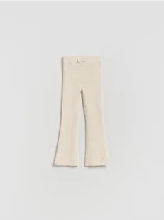 Spodnie typu flare, wykonane z dzianiny z dodatkiem bawełny.