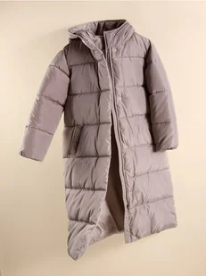 Reserved - Długi pikowany płaszcz z kapturem - beżowy
