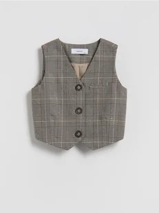 Kamizelka o prostym kroju, wykonana z tkaniny z dodatkiem wiskozy.