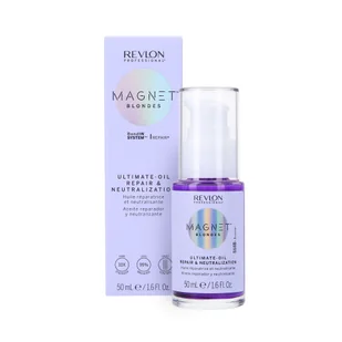 Revlon Magnet Blondes Ultimate Oil Repair & Neutralization to profesjonalny olejek opracowany specjalnie z myślą o włosach blond, rozjaśnianych, siwych i z pasemkami. Łączy w sobie działanie regenerujące, ochronne i tonujące, dzięki czemu stanowi kompleksową pielęgnację dla wymagających pasm. Formuła wzbogacona została o fioletowe pigmenty neutralizujące, które skutecznie redukują niepożądane żółte tony i przywracają włosom chłodny, świetlisty odcień. Technologia BondIN System™ wspiera odbudowę wewnętrznych wiązań włosa, zwiększając jego odporność i elastyczność, a jednocześnie zmniejszając łamliwość. Dodatkowo olejek zawiera składniki odżywcze, takie jak olej kokosowy i olej jojoba, które wygładzają strukturę włosa, domykają łuski i chronią końcówki przed rozdwajaniem.