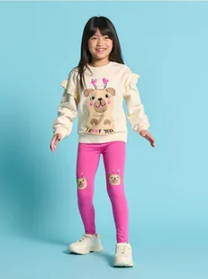 Sinsay - Komplet dzianinowy - różowy - okrągły dekolt,długie rękawy z ozdobnymi falbankami na ramionach,zakończona ściągaczami,ozdobny print na przodzie bluzy oraz na kolanach,elastyczna gumka w pasie