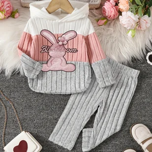 TEMU 2-częściowy zimowy ciepły zestaw dla dziewczynek: sweter z kapturem i spodnie - miękki pastelowy róż i prążkowany strój z długim rękawem z
