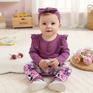 TEMU Wiosenno-Jesienny dla Dziewczynek: Długi Rękaw z Falbankami, Spodnie w Kwiaty i Opaska z Kokardą, Idealny na Spacer i Zabawę na Zewnątrz