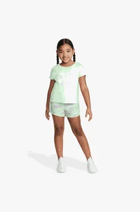 Ten dwuczęściowy funkcjonalny zestaw został zaprojektowany z myślą o dziecięcym stylu. Koszulka jest wykonana z dzianiny oraz ma krótkie, kimonowe rękawy i zwiewny, luźny krój, dzięki czemu zapewnia swobodne dopasowanie i stylowy wygląd. Pasujące do niej spodenki są wykonane z lekkiej tkaniny oraz mają wbudowany elastyczny pas zapewniający wygodne dopasowanie i podszewkę odpowiadającą za pełną osłonę podczas biegania, skakania i innych aktywności. Dodatkowo oba elementy są wykonane z szybko schnącego, odprowadzającego wilgoć materiału z technologią Dri-FIT, która zapewnia uczucie ochłody i suc