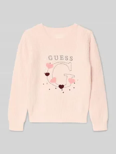 Sweter z dzianiny dziecięcy Guess;Krój regular fit;Prążkowane wykończenia;Okrągły dekolt;Detal z logo;Długość tyłu w rozmiarze 116: 42 cm;Długość rękawa w rozmiarze 116: 45 cm