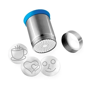 Dekorator do kakao i przypraw firmy Motta w skład zestawu wchodzi pojemnik oraz 3 blaszki z wzorkami.