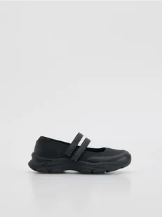 Buty typu baleriny, wykonane z łączonych materiałów.