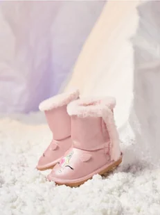 Ocieplane śniegowce z ozdobnym haftem jednorożca i dekoracyjnym futerkiem.