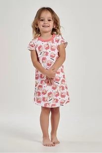 Bawełniana koszula nocna ma popularny wzór jednorożca i jest w kolorze biało-różowym. Koszulka wykonana jest w 100% z bawełny. Posiada okrągły dekolt i krótkie rękawy. Dolna krawędź jest wycięta w łuk. Długość koszulki w rozmiarze 104: