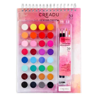 Creadu, Zestaw akwareli 39 elementów zestaw artystyczny marki Creadu zawiera: 32 farby akwarelowe 2 pędzle 2 ołówki 1 metalową temperówkę 1 gumkę 1 szkicowni...