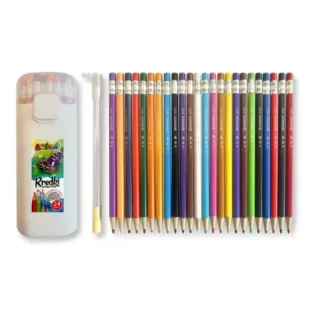 Komplet 24 szt.kredek ołówkowych z grafitem o grubości 2,5 mm, automatycznie wysuwanym z obudowy po uruchomieniu przycisku. W zestawie mini temperówka do rysików. Całość w praktycznej tubie chroniącej zawartość przed uszkodzeniem.