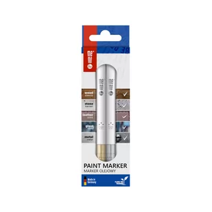Marker olejowy MM300 MemoBe, końcówka okrągła 1-1,5 mm złoty i srebrny op. kart. Marker olejowy MemoBe z tuszem w kolorze złotym i okrągłą końcówką w rozmiarze 1-1,5 mm. Przeznaczony do trwałego znakowania i dekorowania prawie wszystkich powierzchni, jak np. : metalu, szkła, plastiku, kartonu, drewna itd. Wysoce kryjący, doskonały również do ciemnych i transparentnych powierzchni.
