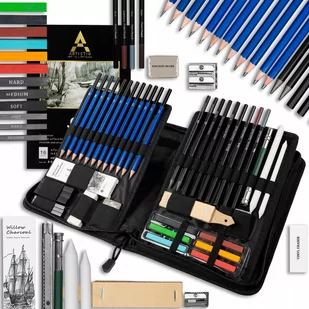 - Profesjonalny zestaw ołówków i węgli wraz z niezbędnymi przyborami do szkicowania renomowanej marki ARTISTIQ.