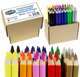 Zestaw 60 kredek JUMBO Nr 2 10 kolorów kredek po 6 sztuk ( w tym kolor złoty i srebrny ) Kredki marki BAMBINO kredki o profilu trójkątnym szerokość: 1 cm wygodne tekturowe pudełko które służy za stojak/przybornik na kredki. tektura w naturalnym kolorze EKO idealnie sprawdzi się na biurku, ławce w szkole/przedszkolu. Wymiary pudełka: 13x7x18 cm