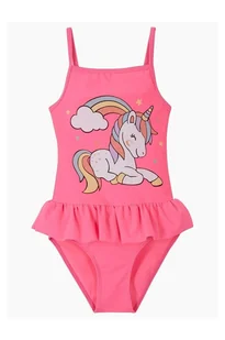 Kostium kąpielowy dziewczęcy ze zrównoważonego materiału: Śliczny kostium kąpielowy z motywem jednorożca. Świetny kostium kąpielowy, zachwyci przede wszystkim miłośniczki jednorożców. Ozdobna falbana na wys. bioder. Wąskie ramiączka.