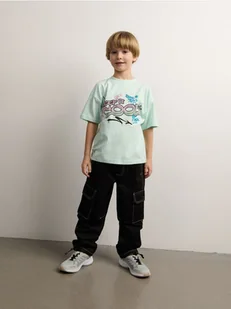 Spodnie typu cargo, wykonane z gładkiej tkaniny z bawełną.