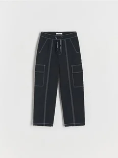 Spodnie typu cargo, wykonane z gładkiej tkaniny.