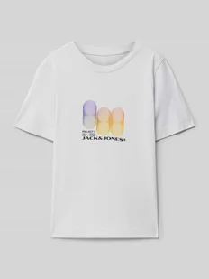 T-shirt dziecięcy Jack & Jones;Czysta bawełna;Krój regular fit;Model ‘CALMA’;Okrągły dekolt z prążkowanego ściągacza;Nadruk z logo;Długość tyłu w rozmiarze 140: 50 cm