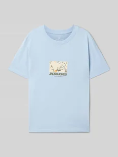 T-shirt dziecięcy Jack & Jones;Czysta bawełna;Krój regular fit;Model ‘TAVIRA’;Okrągły dekolt z prążkowanego ściągacza;Nadruk z logo;Długość tyłu w rozmiarze 140: 52 cm