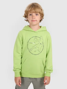 Bluza z kapturem 4F chłopięca - CECHY: gramatura 320 gsm – lekki materiał zapewniający komfort noszenia przez cały dzień zakres rozmiarów 122–164 – dopasowanie do sylwetek dzieci i młodzieży jednostronnie czesane wnętrze – dodatkowa warstwa ocieplająca od wewnątrz krój regular – wygodne dopasowanie gwarantujące swobodę ruchów standardowy fason sięgający do bioder – uniwersalne rozwiązanie na co dzień 80% bawełny – miękka, trwała i przyjemna w dotyku tkanina 20% poliestru – zwiększona odporność na zużycie i deformacje jednolita kolorystyka – łatwa do zestawienia z różnymi stylizacjami dzianina single jersey – miękka i gładka powierzchnia zapewniająca komfort noszenia kaptur zintegrowany z dekoltem – dodatkowa ochrona w chłodniejsze dni mankiety i dół ze ściągaczem – lepsze dopasowanie i utrzymanie ciepła nadruk z przodu z piłkarskim motywem – efektowny detal podkreślający sportowy charakter kieszeń typu kangurka – praktyczne miejsce na drobiazgi i ogrzanie rąk wkładana przez głowę – szybkie i wygodne zakładanie obniżona linia ramion – swobodniejszy krój i modny wygląd Jak prać odzież i obuwie sportowe? Bluza dresowa chłopięca nierozpinana z kapturem idealnie sprawdzi się jako element zarówno casualowych, jak i sportowych stylizacji na co dzień. Posiada krój regular, który wygodnie dopasowuje się do sylwetki. Splot single jersey z jednostronną gładką powierzchnią sprawia, że jest ona elastyczna i komfortowa w noszeniu. Bluza dresowa chłopięca z kapturem posiada średnią gramaturę 320 gsm, która sprawia, że jest ona miękka oraz bardziej przewiewna.