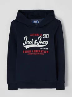 Bluza z kapturem młodzieżowa JACK & JONES;Mieszanka bawełny;Luźny krój;Kaptur w kopertowym stylu;Długie rękawy;Nadruk z logo;Długość tyłu w rozmiarze 140: 52 cm;Długość rękawa w rozmiarze 140: 53 cm