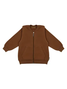 Bluza dresowa, bomberka dla chłopca, ze stójką, w kolorze brązowym. Z przodu dwie kieszonki w typie "kangurka". Ściągacze w rękawach i na dole w kolorze bluzy, zapinana na praktyczny zamek.