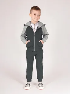 Bluza dresowa dla chłopca z kapturem wykonana z bawełny dresowej w kolorze szarym z dodatkami grafitowych elementów. Bluza zapinana na zamek z kieszeniami w kształcie "kangurka". Materiał posiada certyfikat Oeko-Tex Standard 100 Tekstylia godne zaufania.