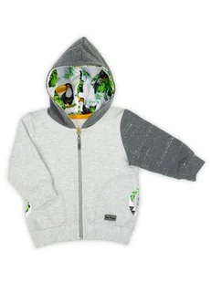 Wyprodukowano w Polsce Sportowa bluza z kapturem dla chłopca, uszyta z szarej bawełny dresowej. Od środka kaptur został podszyty bawełną w jaskrawych kolorach z motywem tukanów. Przy rękawach oraz w pasie wszyto ściągacze. Produkt zapinany jest na zamek, posiada kieszenie. Jeden rękaw został wykonany z koloru grafitowego.